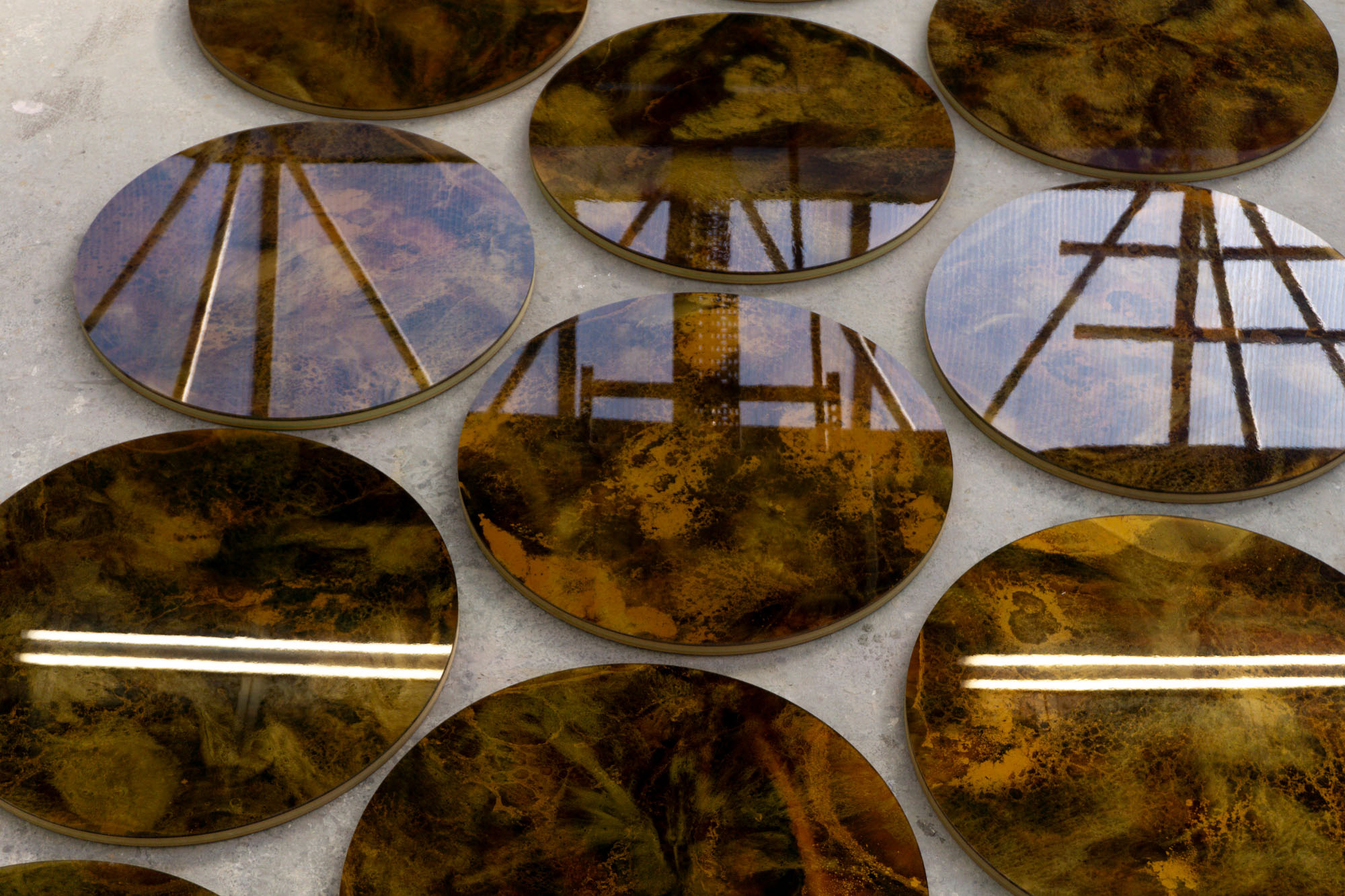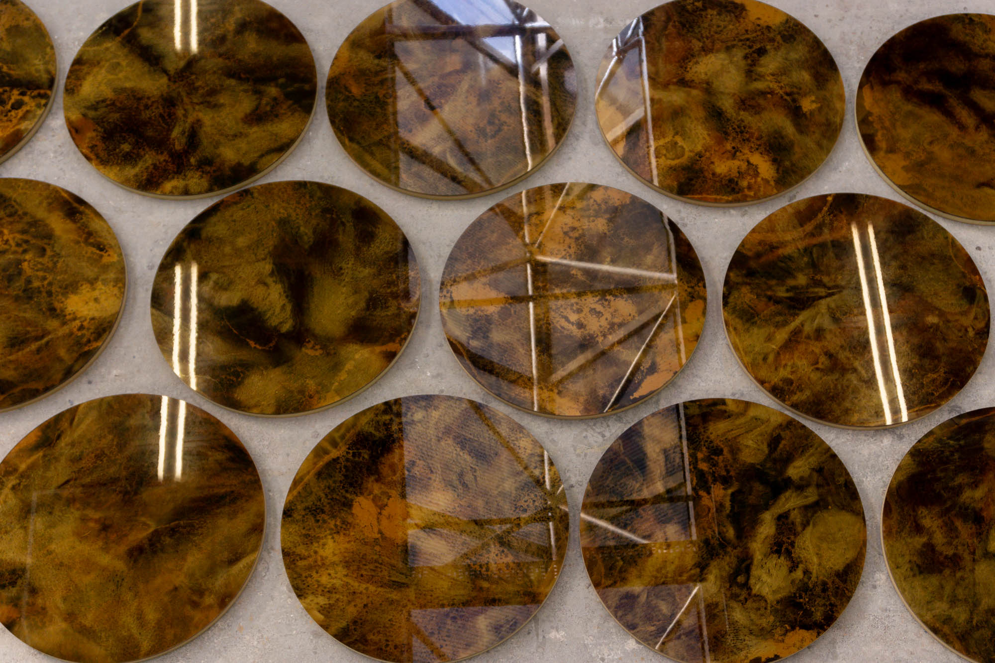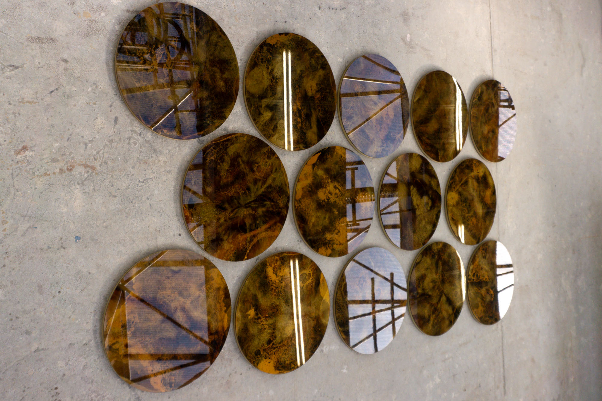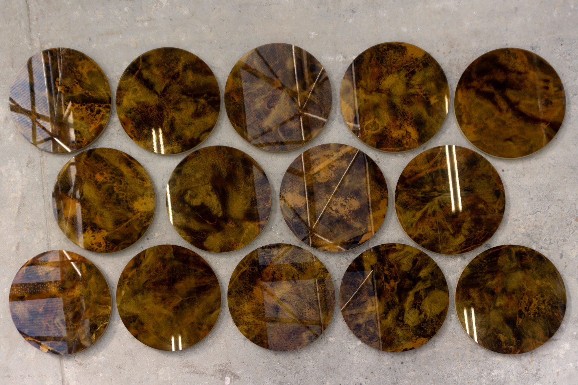 Resin, metal powders and pigment on board A set of 14 coffee tables finshed in mirror polish hand poured resin. A multipour technique was utilised to create a galactic motif in a colour palette which compliments a hardwood environment.