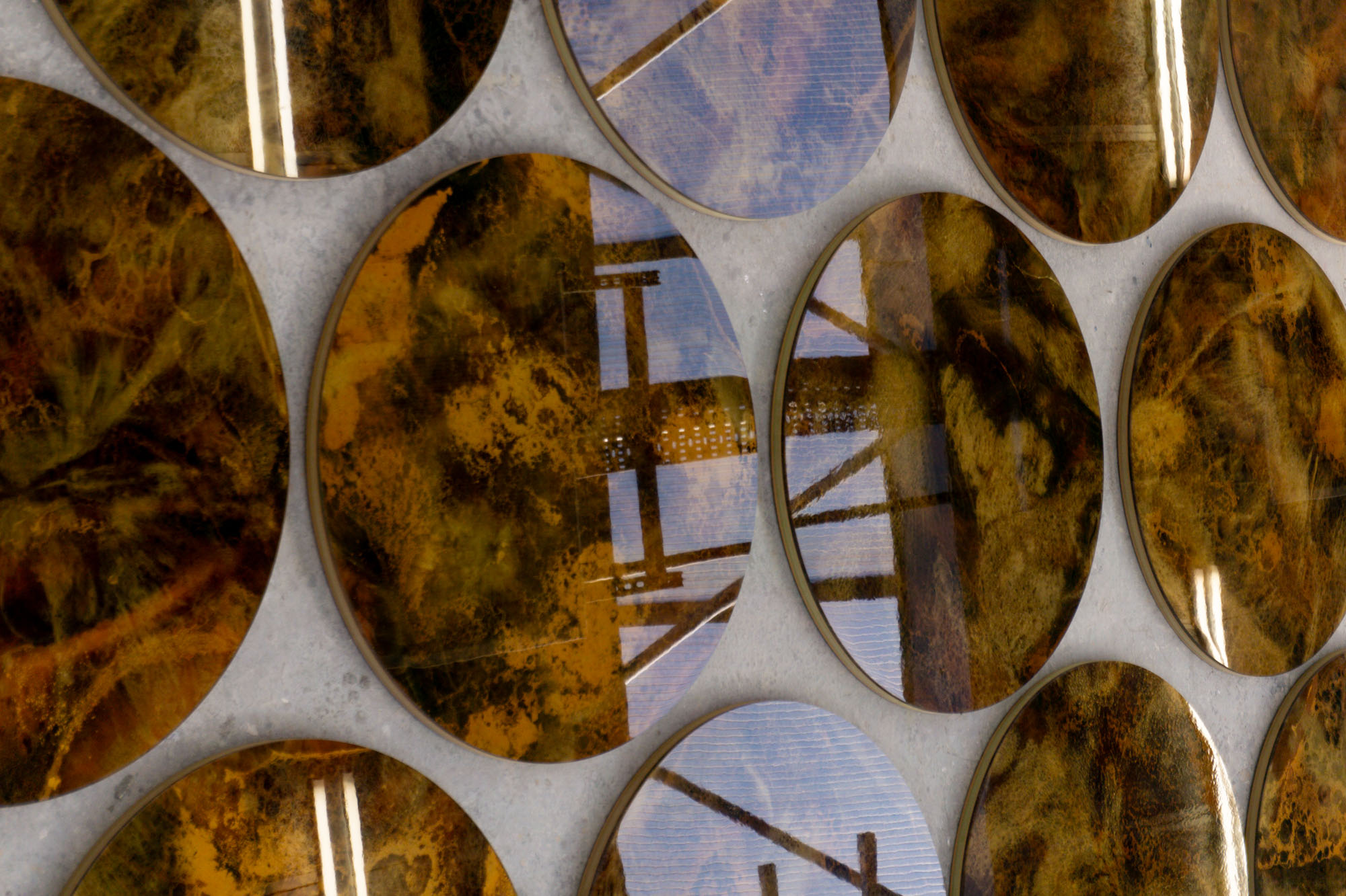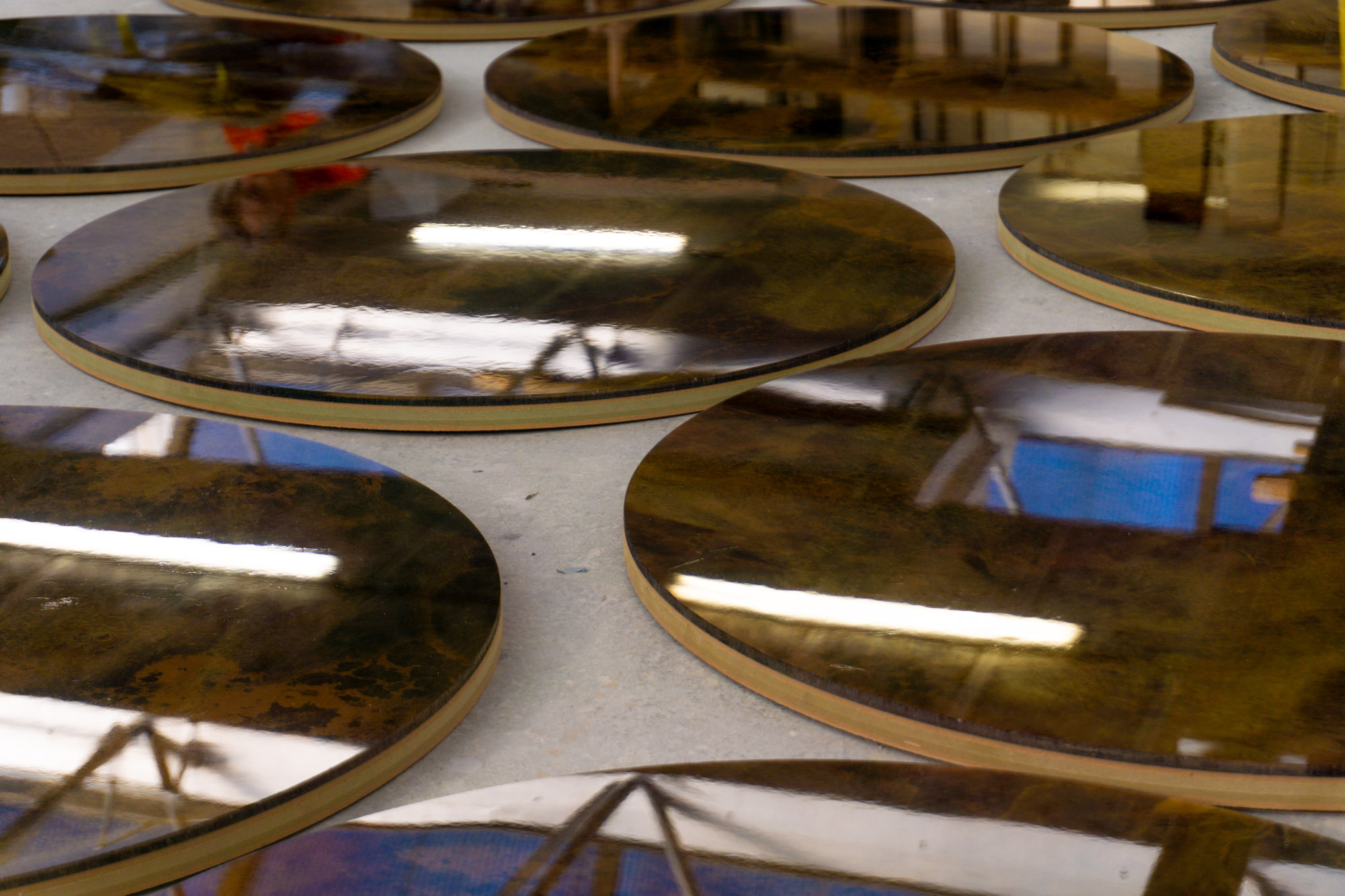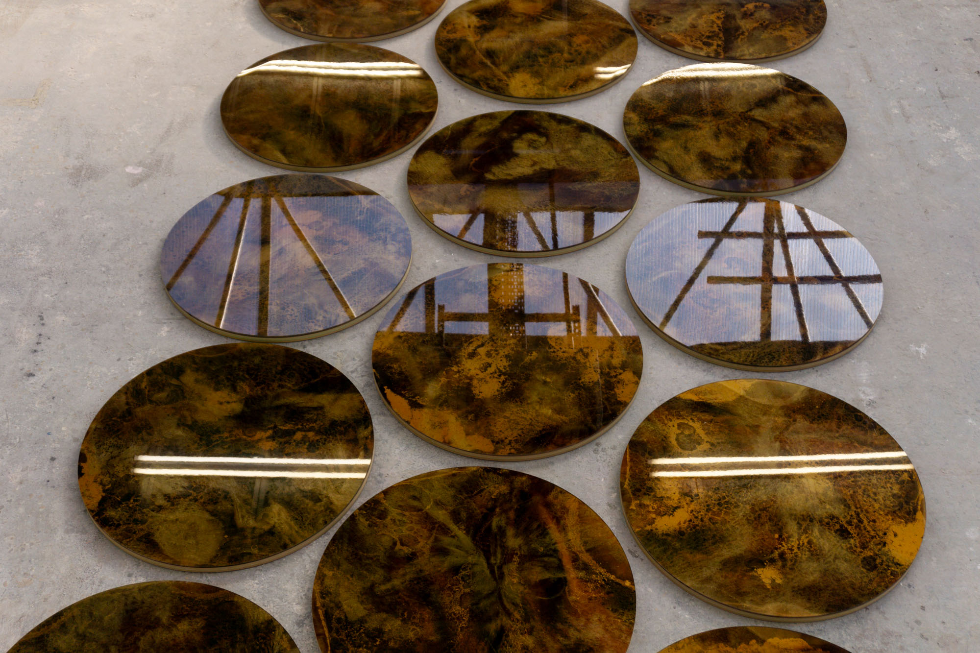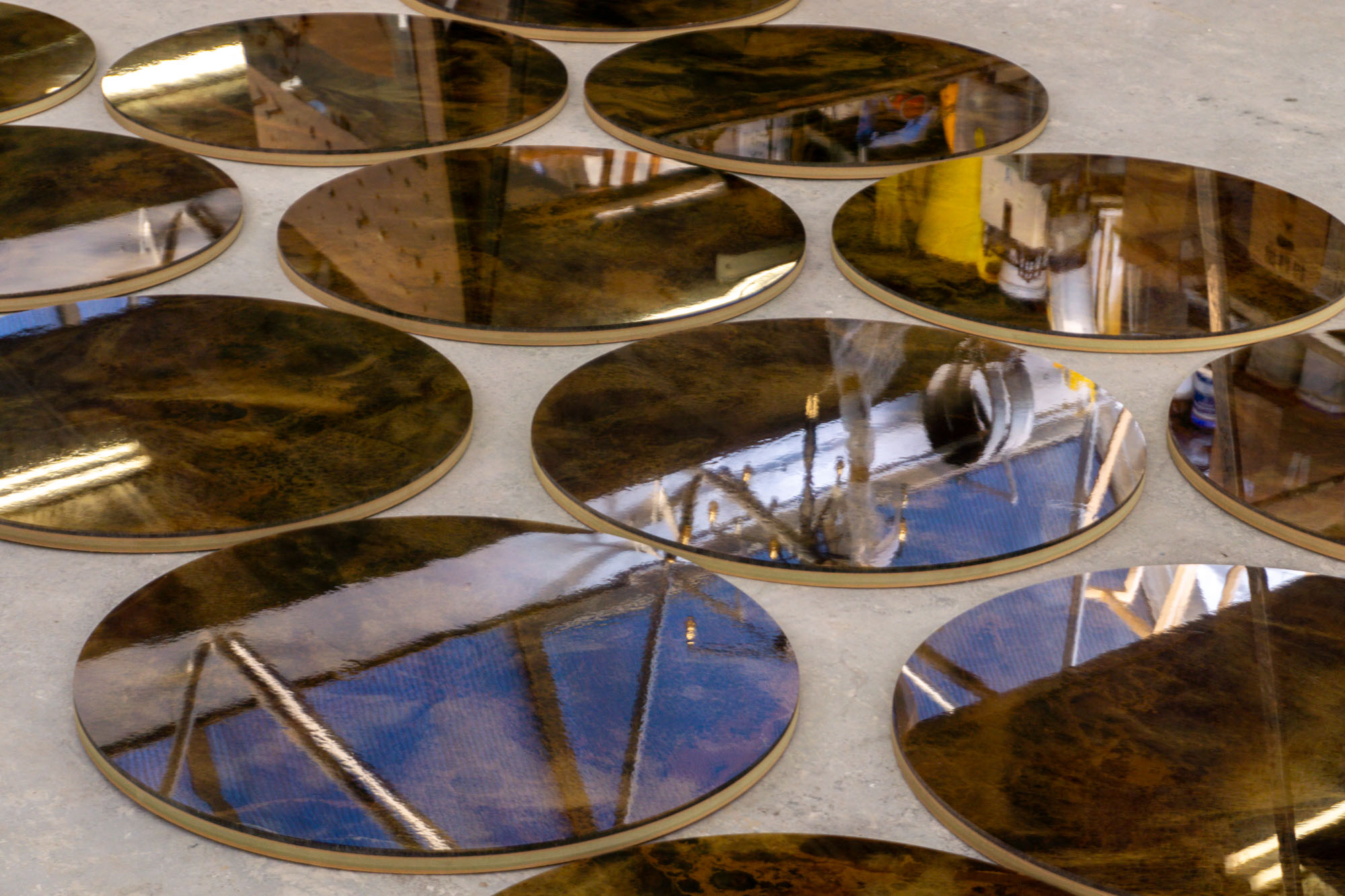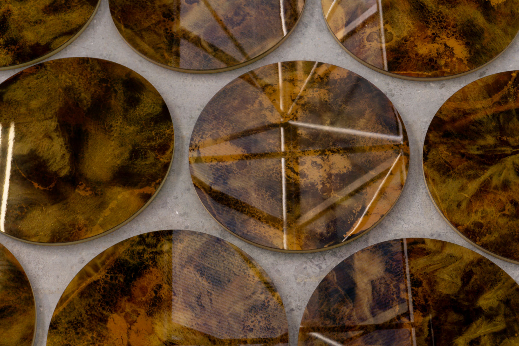 Resin, metal powders and pigment on board A set of 14 coffee tables finshed in mirror polish hand poured resin. A multipour technique was utilised to create a galactic motif in a colour palette which compliments a hardwood environment.