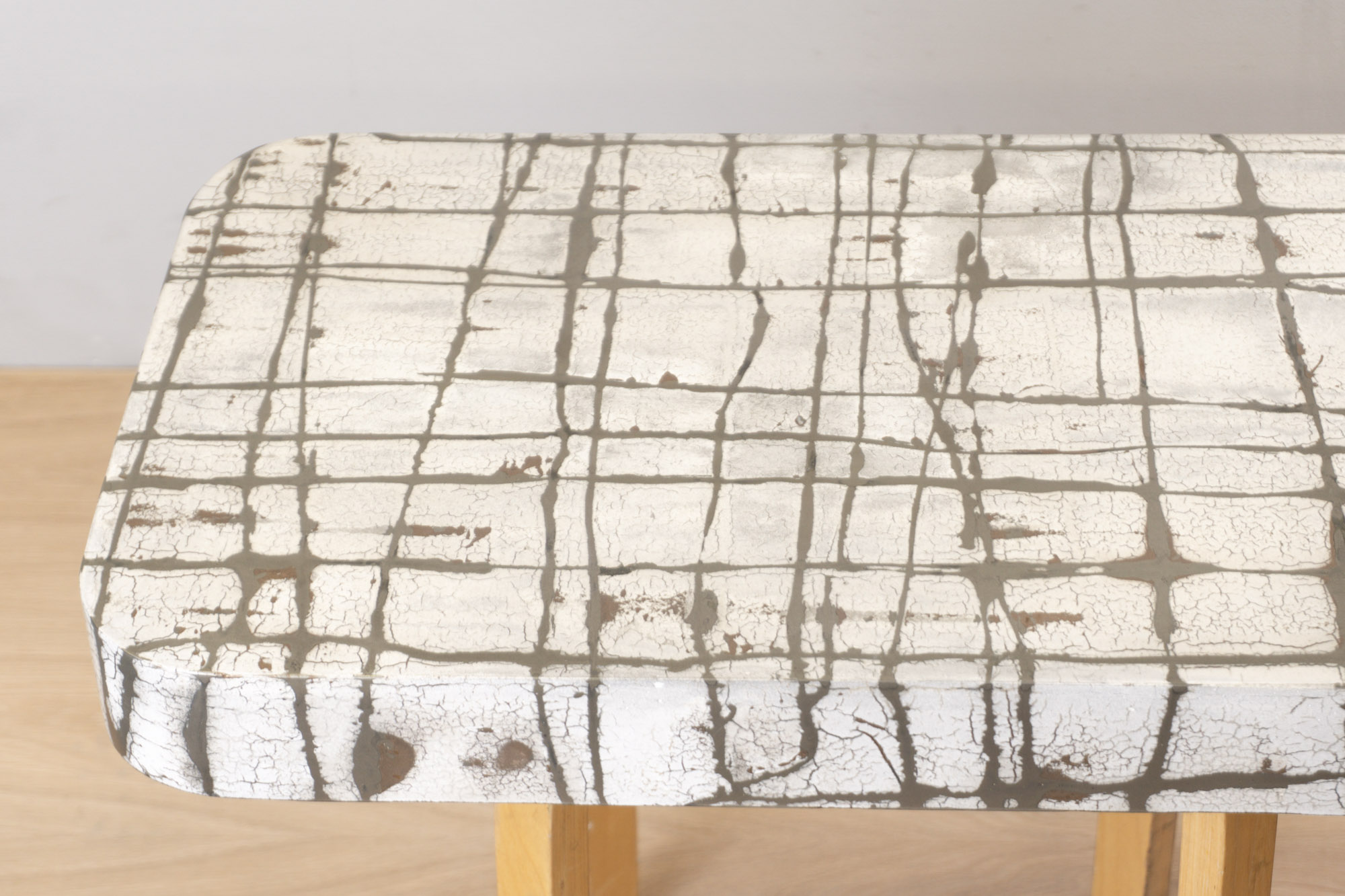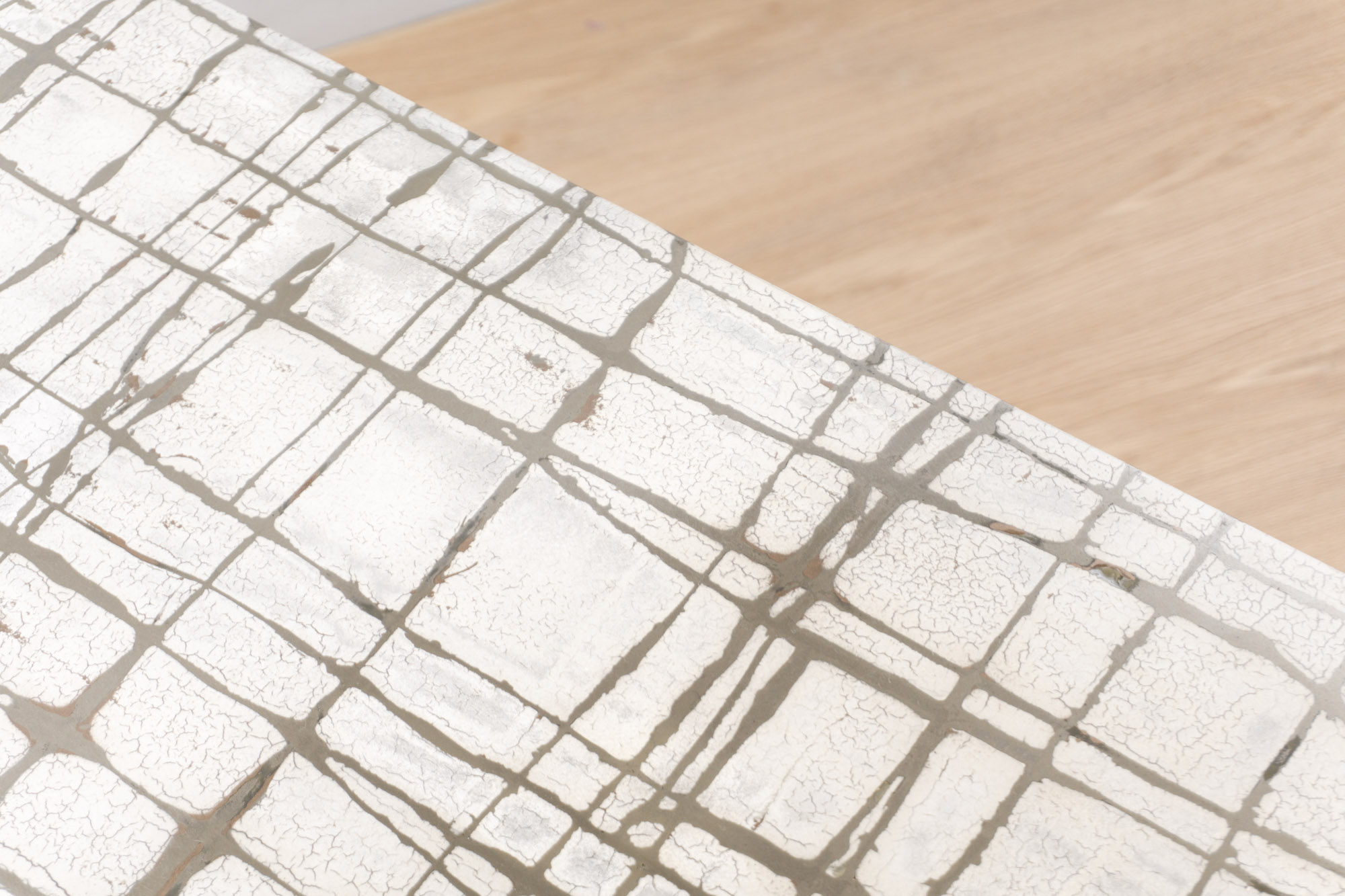 Plaster, Resin, Metal Powders, Pigments on Board A polished table top constructed with Tachismic influences and a Baroque palette, evoking notions of classical ruins, bringing historical themes to a modern setting. Plaster is force aged under intense heat to form a cracked, porous surface. The whole piece is laminated with metal powders suspended in resin and polished to a high gloss.