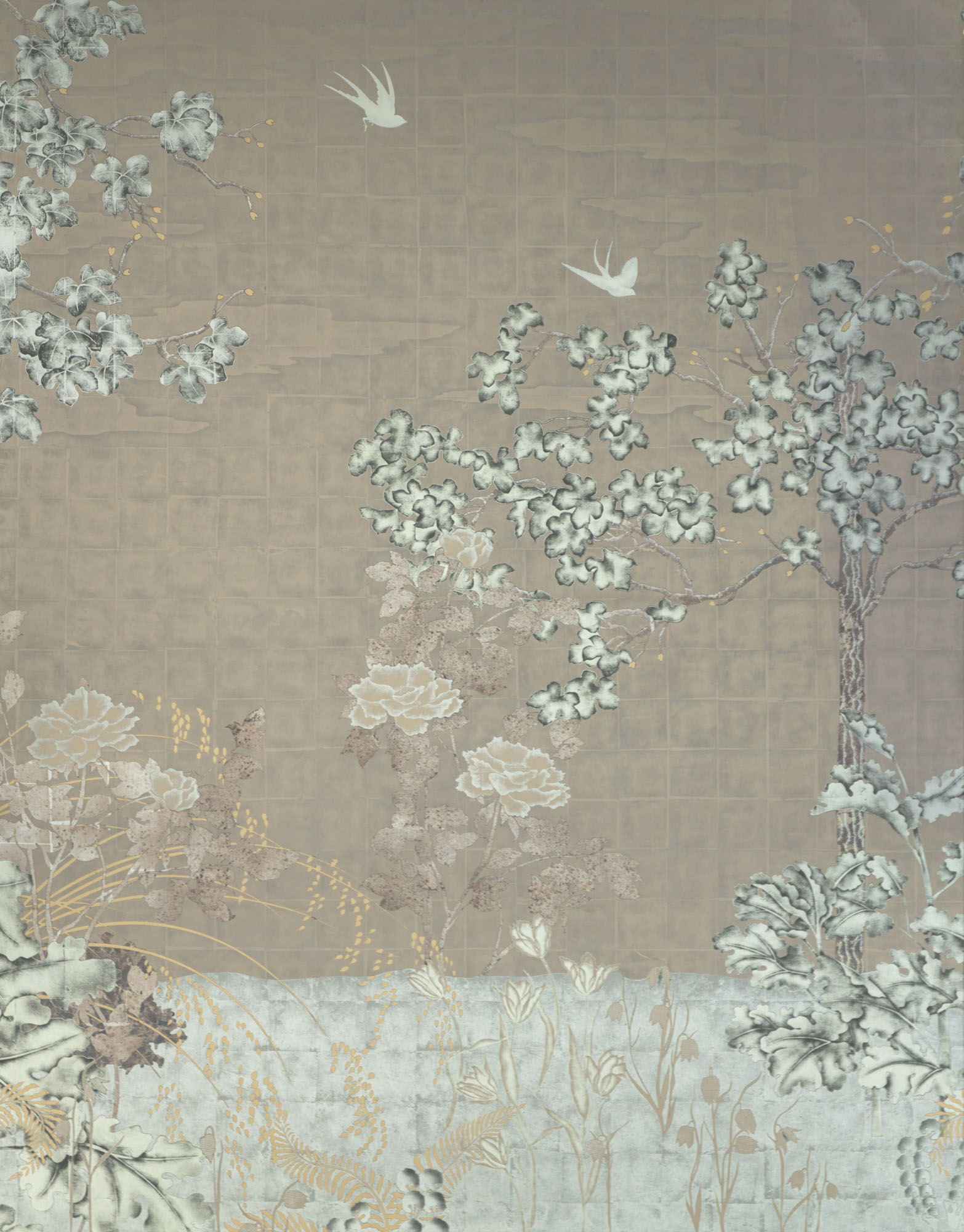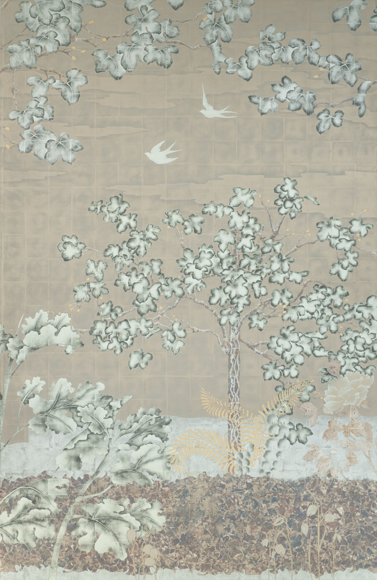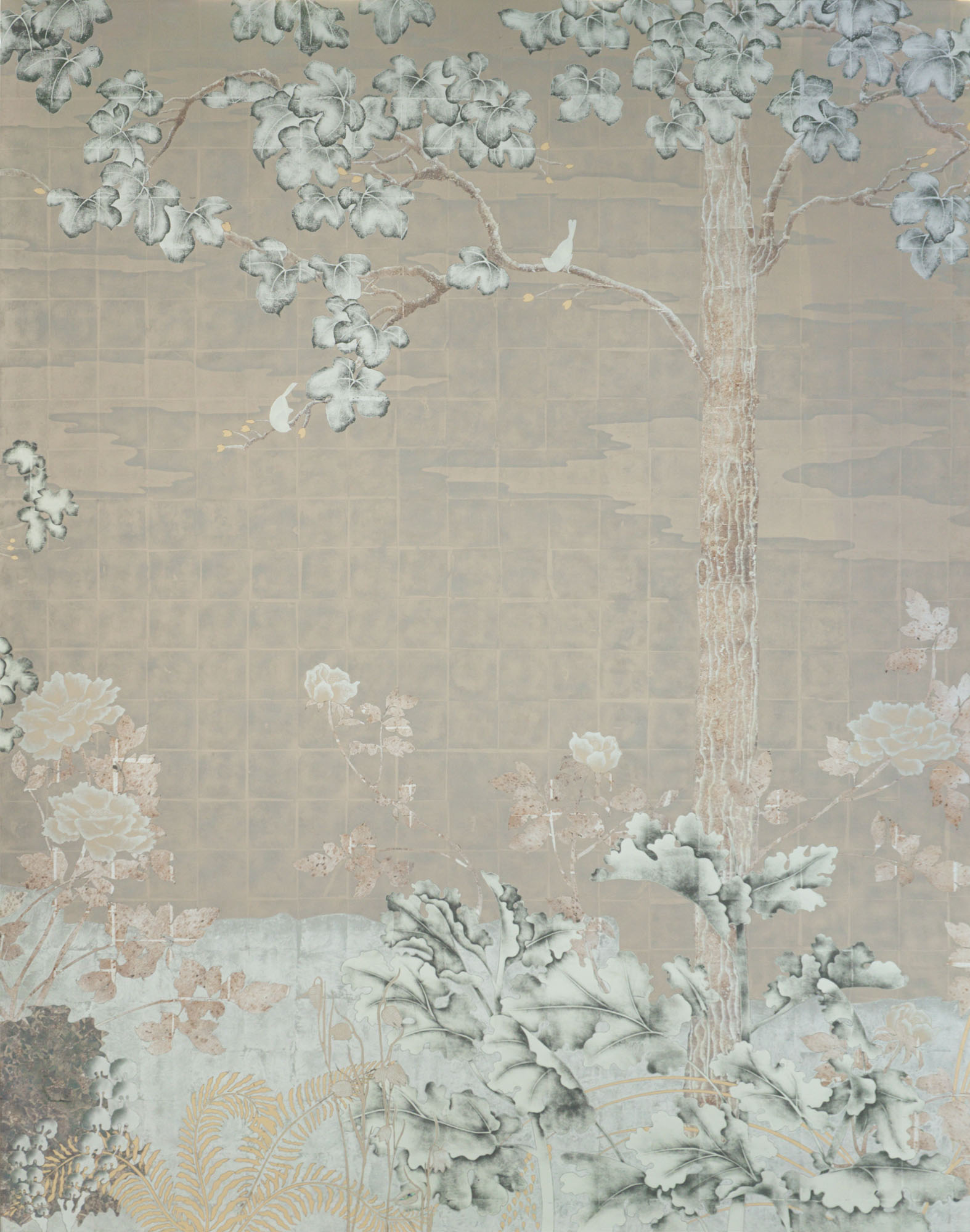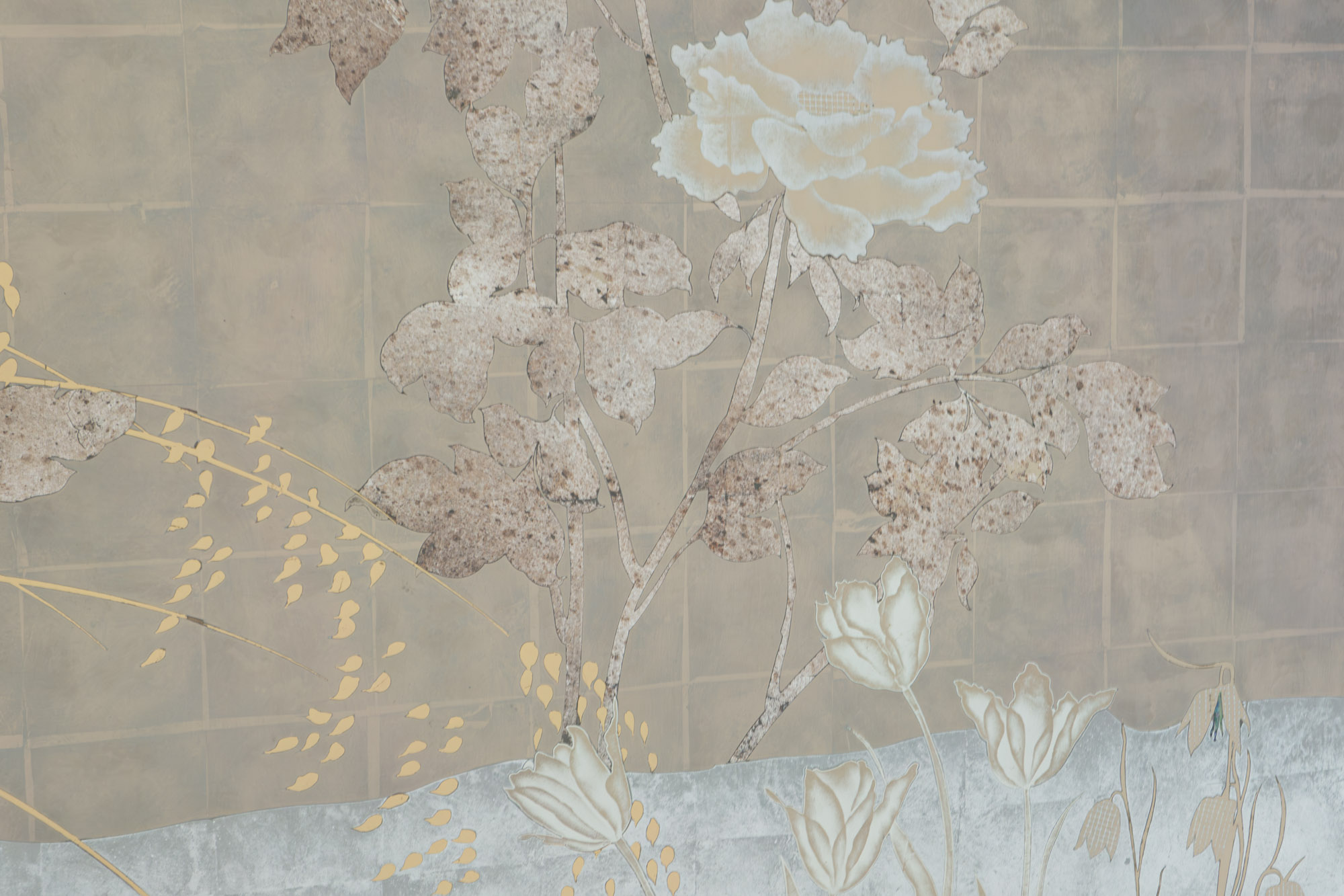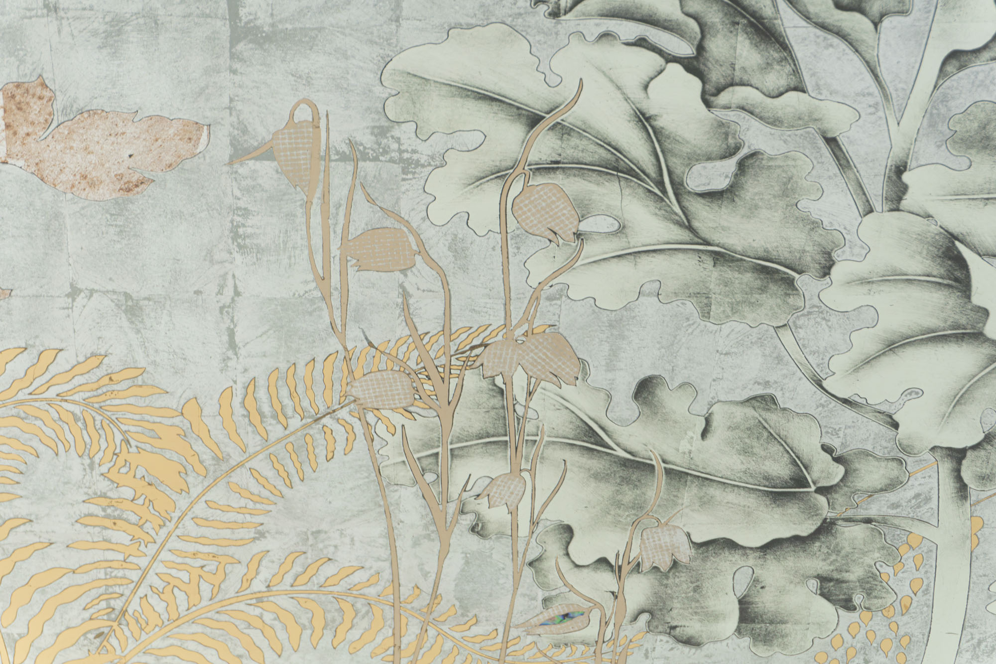 White, Green, Champagne, Moon & Red Gold with Aged Silver on Glass A six panel églomisé glass artwork that stylistically takes its cue from traditional European tapestries and the Art Deco screens of Rateau, Edgar Brandt and Jean Dunand. In addition, in creating the mise en scène for this piece we were inspired by the history and tradition of the early Botanical Gardens created in Holland from the 16th century onwards. A place where connoisseurs and enthusiasts displayed their latest precious acquisitions from across the world, growing exotic lilies, orchids and tulips and displaying also citrus and fruit trees never seen in northern Europe in the open.
