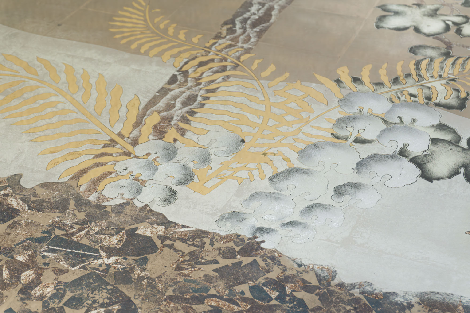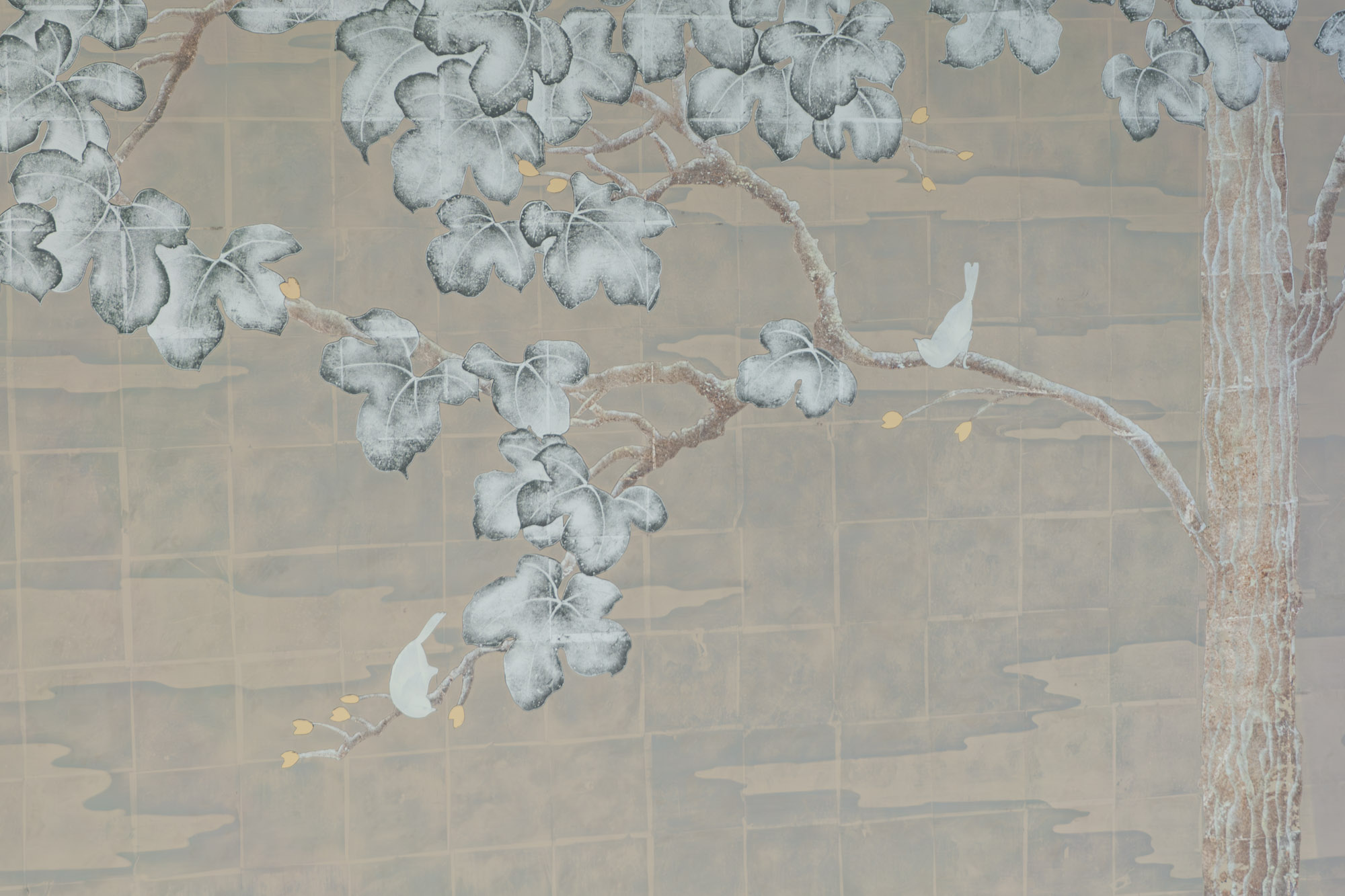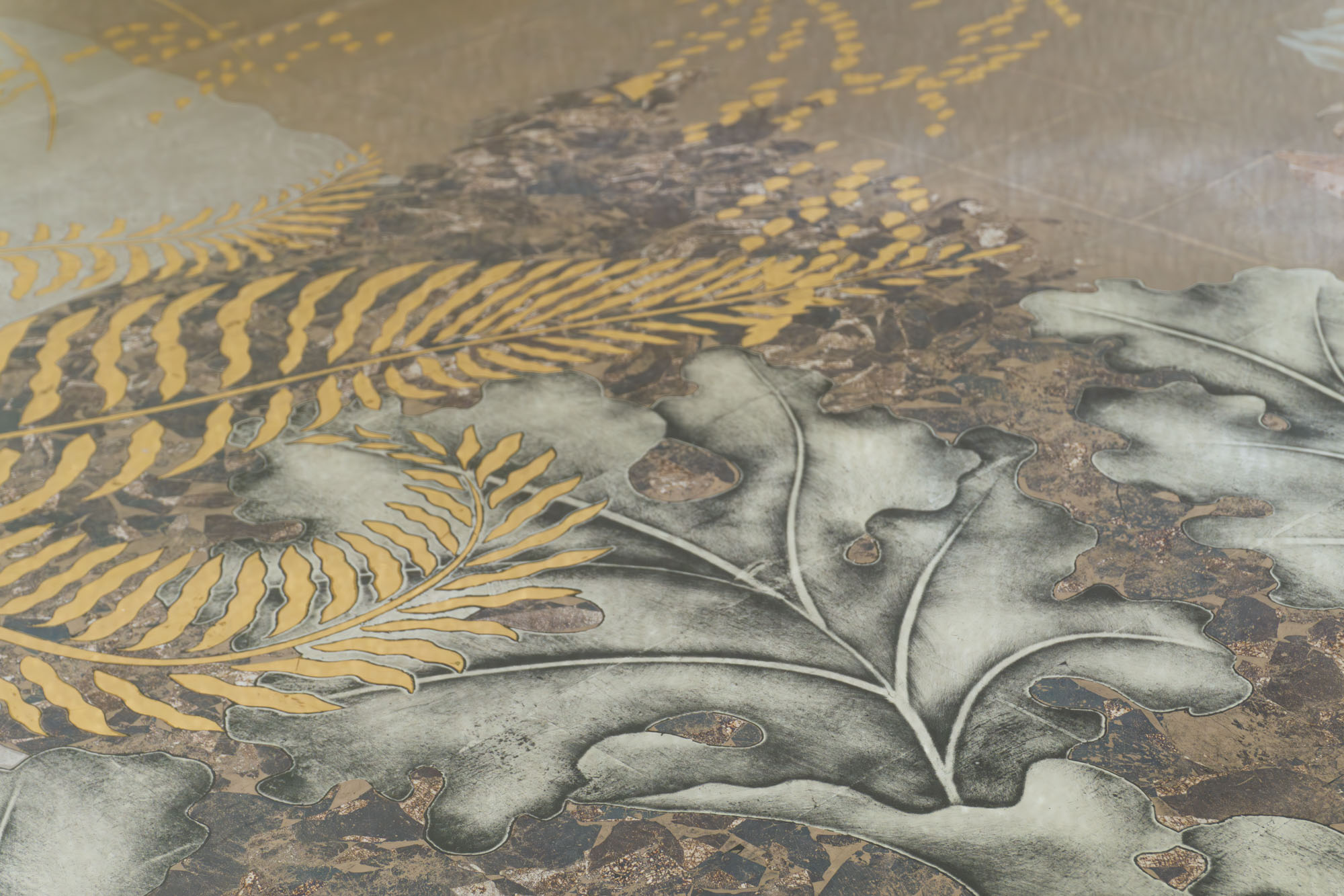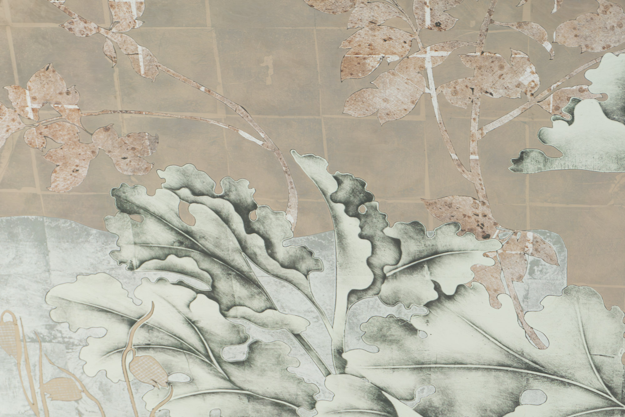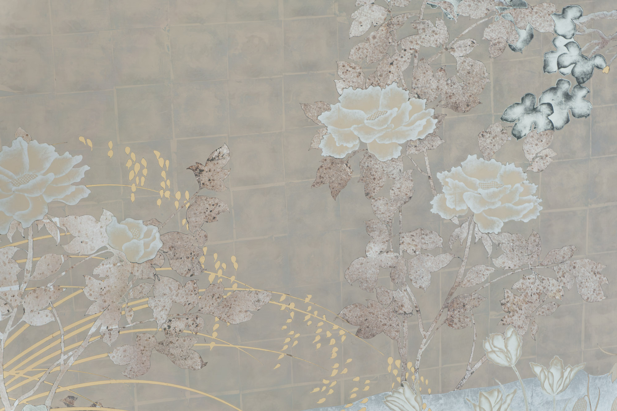 White, Green, Champagne, Moon & Red Gold with Aged Silver on Glass A six panel églomisé glass artwork that stylistically takes its cue from traditional European tapestries and the Art Deco screens of Rateau, Edgar Brandt and Jean Dunand. In addition, in creating the mise en scène for this piece we were inspired by the history and tradition of the early Botanical Gardens created in Holland from the 16th century onwards. A place where connoisseurs and enthusiasts displayed their latest precious acquisitions from across the world, growing exotic lilies, orchids and tulips and displaying also citrus and fruit trees never seen in northern Europe in the open.
