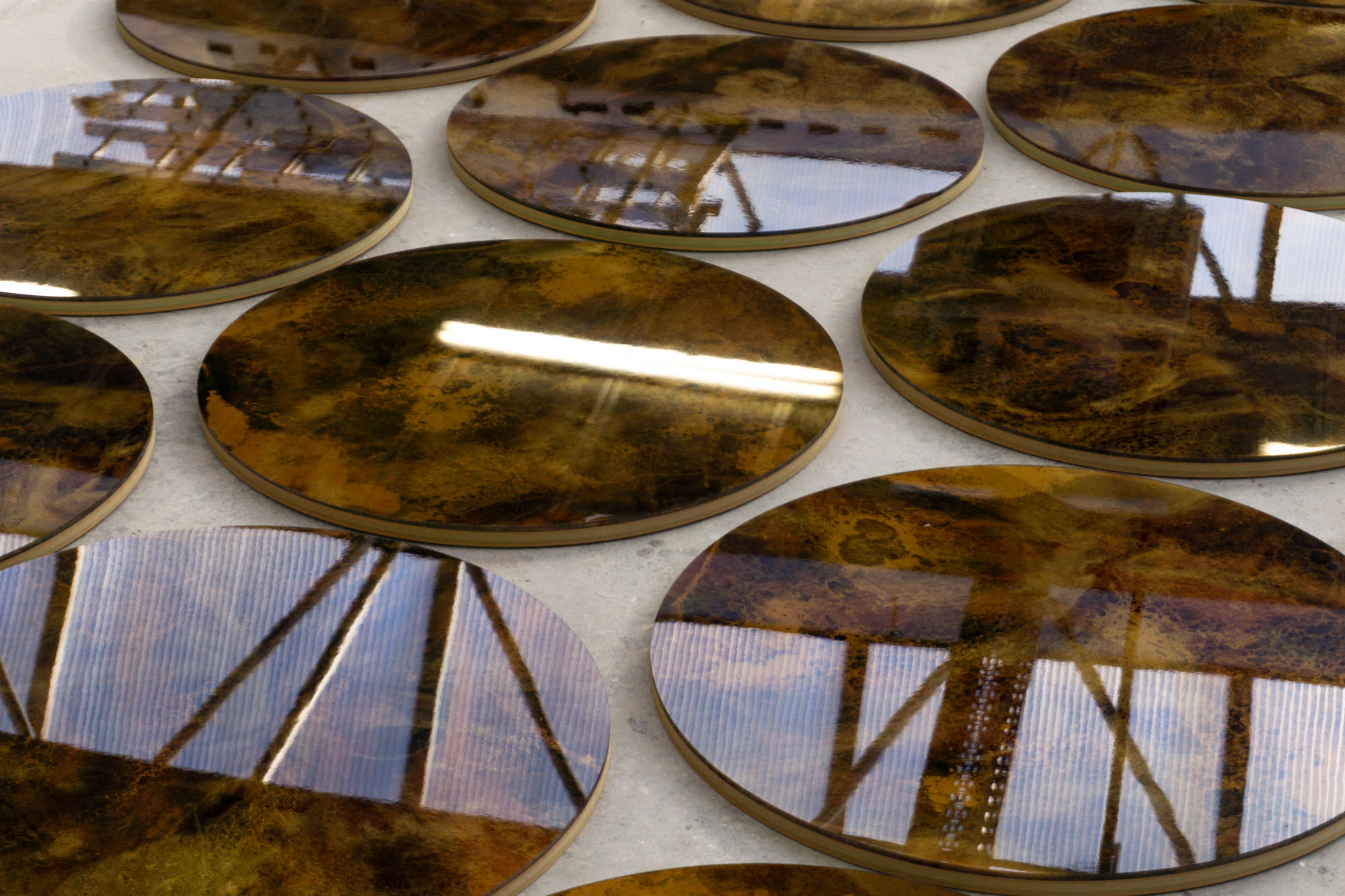 Resin, metal powders and pigment on board A set of 14 coffee tables finshed in mirror polish hand poured resin. A multipour technique was utilised to create a galactic motif in a colour palette which compliments a hardwood environment.